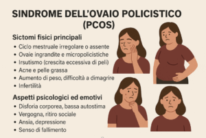 - Mascolinizzazione percepita: irsutismo, acne, irregolarità mestruali, a volte alopecia possono minacciare l’identità femminile e il senso di desiderabilità.